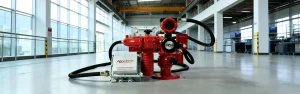 Мобильная пожарная пушка: устанавливается на колесную платформу или салазки, что позволяет быстро перемещать её по территории объекта. Идеальна для временных зон хранения или объектов, где требуется оперативное развертывание.