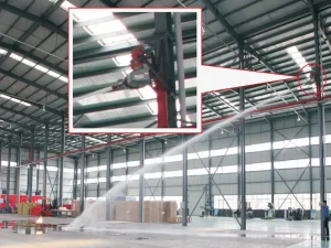 Складская пожарная пушка: предназначена для защиты складских помещений с высокими стеллажами. Часто используется в логистических центрах и ангарах.